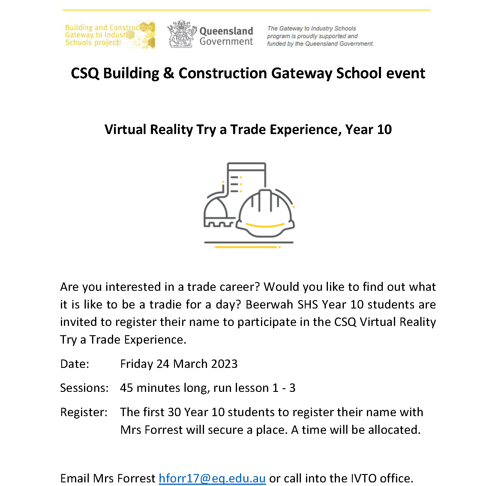 This page is updated on a regular basis with information about current opportunities available to cohorts of students at Beerwah SHS. If you would like to access more information or support from Malou directly, please e-mail her via mgemi0@eq.edu.au visit her office behind the Resource Centre either before school or during break times.
